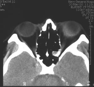 1 患者男性,32岁。998月发现左眼球突出,当时按眶内炎症治疗无效9912月左眼开始充血,反复发作(后来仅间隔1-2天),头痛。曾按“结膜炎、眼眶炎症”等治疗无效。20004月经CT检查发现左眼球外侧肿物,诊断:眼内肿物、眶内炎性假瘤?随来我院。入院检查:视力(戴镜)右眼1.0,左眼0.3,不能矫正。左眼睑肿胀,结膜混合充血,结膜下血管怒张(图1)。角膜正常,屈光间质清楚。眼底为高度近视眼底表现(-10D),眼球壁内下方600-900自视盘下方开始隆起(约+6D)。眼球突出4mmB超及标准化A超显示左眼球内下方及下方巩膜肥厚,最厚处达7mm,可见明显筋膜囊水肿(图2)。CT显示左眼球内下方巩膜增厚,并向眼内隆起,筋膜囊水肿(图3)。
