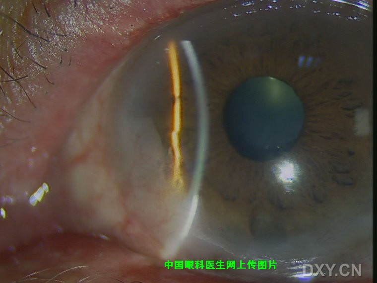 还请大家仔细看图,鼻侧角膜并没有溃疡,更没有局部变薄,而是轻度扁平隆起,再重申一下整个角膜没有染色。 |