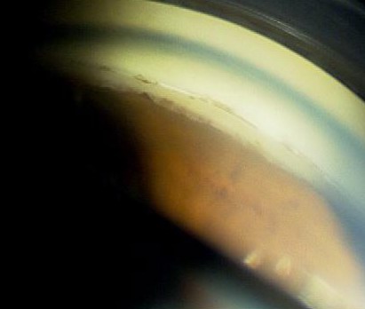 房角镜检查:散瞳前:右360度Schwalbe线突出,颞侧为著。其上可见残存粘连之虹膜组织。虹膜根部起伏不平,其上可见环形印迹和点状隆起,与隆起的Schwalbe线有松弛的粘连。滤帘可见色素,睫状体带及房角隐窝可见入射角15~20度。左眼Schwalbe线轻度突出。,其上亦可见少许残存粘连之虹膜组织。虹膜根部轻度点状隆起。Schlemm管充血。散瞳后:右眼上方部分房角关闭。Schwalbe线与虹膜根部附着范围扩大。360度房角进一步变窄。诊断:Axenfeld综合症。