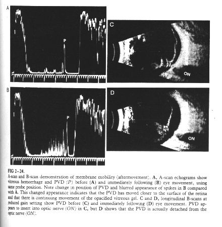A超检查在鉴别玻璃体与视网膜时很有用的。这一方法是基于发现视网膜和玻璃体膜在周边部具有不同的反射率。RD保持很高的反射率,而PVD在它附着于周边部眼底时反射率降低。唯一的例外是在下方周边部,该处的玻璃体膜与视网膜相似,有很高的反射率。