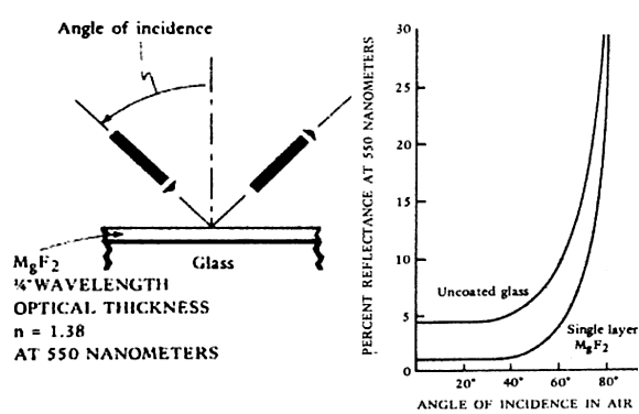 contrast. Thus, all fine camera lenses have antireflection coatings. Surface reflectance depends on the difference in refractive indices for air and glass. For visible light, this is approximately the difference between 1 and 1.5. By selecting a material with a refractive index that falls between these two values (near the geometric mean), and by applying a coating of approximately 0.25 wavelength optical thickness to the surface, it is possible to reduce the reflectance significantly (Fig. 15). Magnesium fluoride (MgF2), a durable substance with an index of 1.38 at 550 nm, is the most commonly used coating material for single-layer antireflection coatings. Instead of one reflection at the air-glass interface, there is now a reflection at the air-MgF2 interface and a second reflection at the MgF2-glass interface. These reflections interfere destructively, resulting in a minimum reflectance within the visible spectrum (at normal incidence) of 1.5% or less, as compared with the original 4% for the uncoated glass surface. From the principle of energy conservation, there must be a corresponding increase in overall transmission of a coated surface, including both interfaces. As a specific example, a ray impinging on the surface of an uncoated aspheric lens (refractive index, 1.523) near its edge at an angle of incidence of 58° would have a reflection loss of 8.3%. Lenses with steep front surfaces tend to produce larger angles of incidence and thus produce stronger reflections. However, by the addition of a single-layer MgF2 antireflection coating designed for normal incidence, the reflection loss is reduced by more than one half, to 3.6%. Only at angles of incidence larger than 60° does the reflectance of such a coated surface exceed 4%. A practical way to test whether a lens has been coated is to look at the reflected image produced. Coated lenses produce a bluish or greenish, rather than a yellowish, reflection. High transmission and aesthetics are important reasons why contact lenses are currently so popular. Besides these factors the low reflectance may be beneficial in situations such as reading with a bright light behind and to the side of the head. With normal eyeglasses, the reflected light from the back of the lens would strike an incipient cataract, producing an annoying scattered light on the retina, which decreases the contrast of the retinal image. In a sense, one might consider the crystalline lens to have a type of antireflection coating. The third Purkinje image (from the front surface of the lens) is quite dim. Because the intensity of the reflected image is proportional to the difference in refractive indices between the lens and the surrounding media, a dim reflected image is the result of a small difference between lens and surrounding media. The refractive index of the outer layers of the mammalian lens is close to that of the aqueous. The refractive index gradually increases toward the nucleus. A reflection from a synthetic intraocular lens is quite noticeable, however, because of the large jump in refractive index from aqueous (1.33) to implant (1.48). |