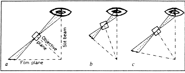 The Scheimpflug principle states that the plane of an obliquely positioned object intersects the plane of the image.42 In the case of the crystalline lens, the slit-lamp beam slices through the lens in an oblique direction. The observer sees only the front or back of the lens in focus because the oblique section through the lens is wider than the depth of focus of the slit lamp. There is a plane in image space, however, that will be conjugate with the oblique object plane. This plane intersects the object plane. In Figure 21, the principle is used by tilting the slit-lamp objective and/or the film plane. Thus, a special Scheimpflug slit lamp camera will have the film plane not where the observer is, but off to the side, so that the extension of its plane will intersect the oblique plane through the lens, somewhere in space. |