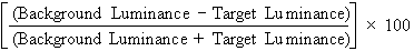 To calculate the contrast of the projected Snellen chart in a darkened room, let us say the background illumination is 97 arbitrary light units, and the target illumination (consisting of letters) is 3 light units. This gives the following: