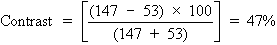 Let us now turn the room lights on, thus placing an additional 50 light units onto both the background and letters of the projected Snellen chart. The new contrast is given by the following: