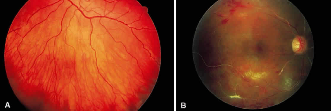 Fig. 1. Vascular sheathing. A. Thin white lines surround retinal venule. B. Exudative-type arteriolar sheathing.