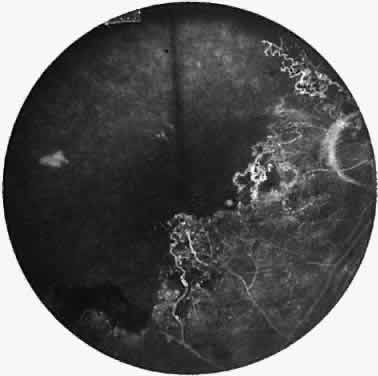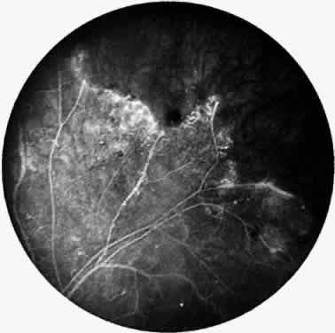 Fig. 3. Fluorescein angiogram of the peripheral retina demonstrates the junction of normally perfused retinal vessels adjacent to an area of nonperfused retina. Notice the vascular abnormalities at the junction.