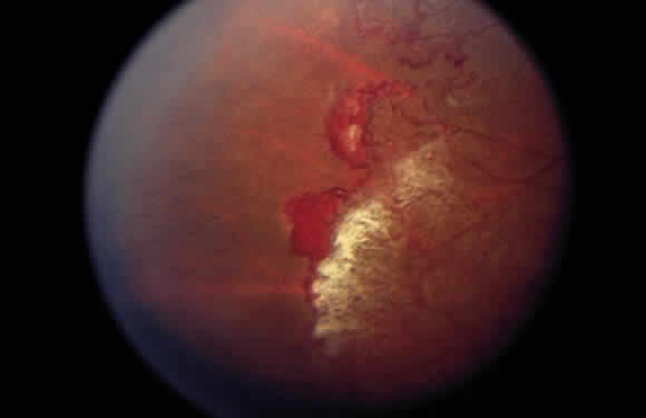 As a result of the retinal nonperfusion, new vessels can form either on the disc (neovascularization of the disc) or, more commonly, neovascularization can occur elsewhere in the retina (Fig. 5). These abnormal blood vessels can hemorrhage and are the major cause of visual loss in this disease. The neovascularization in the peripheral retina usually occurs at the junction of perfused and nonperfused retina, similar to the appearance of neovascularization in the peripheral retina in diabetic retinopathy and the other peripheral proliferative retinopathies. Neovascularization can be associated with extensive fibrovascular proliferation and fibrosis (Fig. 6). The anteroposterior and tangential traction resulting from the fibrovascular proliferation places these eyes at risk for development of retinal detachment. Neovascularization of the iris also has been described.