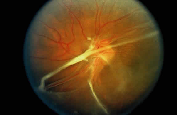 Fig. 6. Hypovascular fibroproliferation emanating from the disc. Usually, the vascular component of this proliferation is less prominent than that seen in the other proliferative retinopathies. Notice the tractional retinal detachment.