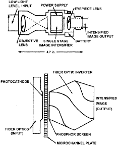 headlights or street lights. Fig. 19 illustrates a schematic model of a hand-held monocular pocketscope that is about 4 in. long. The instrument provides a patient with a 40-degree field of view and gives the patient his or her best daylight vision at night in one eye; it has a green display. This monocular device can be head mounted. Monocular devices are most useful in patients with a best corrected vision of better than 20/200 and a visual field diameter of greater than 20 degrees in at least one eye. Candidates considering a monocular device should also have good mobility in daylight with one eye patched. Patients who depend heavily on a far temporal crescent for mobility are not good candidates; nor are patients who, because of a central scotoma, cannot view the output screen in these devices. The patient should be advised to assess the value of the device for routine activities before making a decision as to whether or not to obtain it. A new generation night-vision device is presently being field tested. This binocular electro-optical device (about 1.25 in. thick) is worn like a pair of glasses. This instrument uses digital amplification and has a black and white display. It is connected to a powerpack that can be carried in the patient's pocket or attached to a belt. This instrument has a 40-degree field of view. It remains to be determined whether this binocular night vision aid will be more helpful than a handheld monocular device for patients with retinitis pigmentosa and other night blinding retinal disorders. |