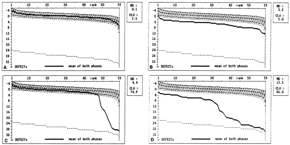 by inconsistent or fluctuating responses in that area.9,10 Initial localized visual field defects may be either relative or absolute. In 35 eyes