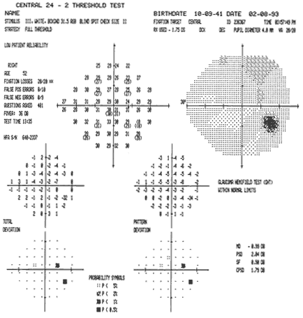The gray scale is not useful in interpreting SWAP visual fields; SWAPac on the Humphrey is required to correctly interpret the data. Frequency Doubling Technology Frequency doubling technology (FDT) tests the magnocellular pathway. These large diameter fibers make up about 3% to 5% of retinal ganglion cells. Full threshold FDT tests can be completed in less than 6 minutes per eye, and suprathreshold screening can be completed within 1 minute. Results are significantly correlated to testing done using the HFA20 (Figs. 23 to 25). In FDT perimetry, 17 regions are tested within the central 20 degrees of the visual field. Each stimulus is a series of black and white bands that flicker at 25 Hz. A normal eye perceives the illusion of twice the number of bands more closely spaced. Glaucomatous eyes have diminished contrast sensitivity as a result of preferential damage to the My cells and they thus require higher contrast to detect the frequency doubling illusion.24 FDT has been found to have up to 97% sensitivity and specificity for detecting glaucomatous defects.25 EVALUATING THE PATIENT WITH GLAUCOMA Deciding which visual field test to order must be made on a case-by-case basis. The central 24 degrees or 30 degrees automated field test is the most useful test in most glaucoma patients, but it is not necessarily appropriate or ideal for every patient. Central Thresholding Programs Most field testing should concentrate in regions known to be defective. In glaucoma, most defects occur within the central 30 degrees. Defects respect the horizontal meridian, so that routine central programs have test locations positioned on either side of the horizontal meridian rather than on the meridian itself. Commonly used programs for glaucoma are the Humphrey models 24-2 and 30-2. A Humphrey program 30-2 is shown in Figure 19 and a program 24-2 is shown in Figure 17. These programs test the central 24 degrees or 30 degrees with 6 degrees of separation between locations. Humphreyprogram 24-2 eliminates the most peripheral ring of test locations from program 30-2, except in the nasal step region. This is advantageous because the peripheral ring of thresholds provides the least reliable data, and testing time can be shortened. Full threshold or SITA standard strategies can be used with either the Humphrey 24-2 or 30-2 programs. Thresholding programs are essential for accurately detecting glaucomatous visual field defects and following patients for progressive damage. Thresholding programs can detect early diffuse depressions of the visual field. Thresholding programs can detect changes in scotoma depth, which is the most common mode of progression. Thresholding programs also permit calculation of the short-term fluctuation, which facilitates the interpretation of field defects. Full threshold or SITA standard canbe used. SITA standard has virtually replaced Fast-pac because it provides more reliable data in a shorter time. Central 10 Degrees A program such as the Humphrey 10-2 that uses tightly spaced locations in the central 10 degrees is preferable to a 24- or 30-degree program in two situations. If a localized defect is detected within 10 degrees of fixation on a standard central test, a 10-degree program can help determine how close to fixation the defect extends (Fig. 26). If the patient has advanced defects, a small central island can be tested with a 10-degree program; the higher resolution provides more data points for follow-up and patient anxiety can be reduced by limiting testing to seeing areas.
