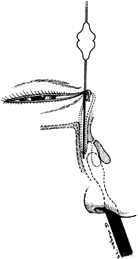 In monocanalicular lacerations, pigtail probe instrumentation poses a significant risk to the opposite canaliculus. This instrumentation system is recommended for experts only, or under closely supervised conditions.81 Identifying the proximal cut end of the canaliculus (or canaliculi) is perhaps the most trying experience in canalicular repair. If the laceration is distal and swelling is minimal, identification generally poses no problem because the canalicular diameter is fairly large (1 to 1.5 mm). If the laceration is close to or into the lacrimal sac and swelling is present, identification may be very difficult because the tissues are distorted and the membranous conduit is compressed. Allowing tissue swelling to subside with time, applying ice compresses, and injecting hyaluronidase solution with massage may restore normal contour and alignment so that the lacrimal laceration may be identified. If the opening cannot be identified, irrigation of the opposite canaliculus with air and flooding the field with water can demonstrate air bubbles emerging from the laceration site.82 Milky corticosteroid suspensions can also be irrigated through the opposite canaliculus and subsequently visualized at the laceration opening. Injection of methylene blue is not advised because it stains the tissues and may further obscure the anatomy. Canaliculitis Most cases of canaliculitis can be cured with vigorous curettage and topical antibiotic eye drops. The canaliculus is anesthetized with a local anesthetic infiltrated in the medial portion of the affected eyelid. The punctum is dilated if needed. Vigorous, repeated curettage of the canaliculus is performed with small and medium-sized chalazia curettes, which are advanced through the canaliculus up to the junction of the lacrimal sac. The repeated curettage maneuvers will withdraw yellow, granular “cementous” material that can be sent for culture and histopathologic examination. The dilated canaliculus often has multiple diverticula, thus the need for thorough curettage. Once the canaliculus has been cleared of all formed material, lavage with 1% tincture of iodine is performed, followed by treatment with antibiotic eye drops (e.g., sulfacetamide eye drops). Most cases of canaliculitis can be cured with this approach. Treatment failure is often due to incomplete curettage. Difficult, refractory cases of canaliculitis can be treated with complete surgical marsupialization (i.e., cut open the entire length of the posterior surface of the canaliculus and openly débride the canaliculus83). Lacrimal Duct Anlage The lacrimal anlage is typically located inferonasal to the medial canthal angle. Treatment is surgical excision of this congenital fistulous drainage tract of the lacrimal sac.84 During surgery, a Bowman's lacrimal probe may be placed within the lacrimal anlage to guide the surgeon. Sharp dissection is performed around the entire anomalous lacrimal fistula until the base is reached. The entire lacrimal anlage is then excised. Vicryl sutures (7-0) are used to close the excised base of the anlage. The remaining subcutaneous tissues and skin are meticulously closed in layers. In young children, with patients still under general anesthesia, it is very important to determine the patency of the lacrimal outflow system and nasolacrimal duct in its entirety. Irrigation or probing should be used to confirm its patency. If a distal nasolacrimal duct obstruction exists, intubation with silicone lacrimal tubes should be performed in young children. It is not necessary to perform DCR in the treatment of these patients. Canalicular Tumors Tumors of the canaliculi are rare and are best treated by complete surgical excision. Surgeons should consider full-thickness resection of the eyelid margin along with the affected portion of the canaliculus. Frozen-section monitoring of the margins should be performed during surgery to ensure complete excision of any lesion. Full-thickness canalicular defects can usually be closed by mobilizing the cut edges and internally splinting the reconstructed canaliculus with silicone lacrimal tubes. Common Canalicular Stenosis A localized stricture of the common internal punctum and segmental closure of the common canaliculus may follow repeated probing, may occur after DCR, and may follow inflammations such as herpes simplex and other inflammatory agents. If the problem is a very localized narrowing of the common internal punctum, silicone tube intubation can be attempted without the need for an open surgical procedure. It is a relatively favorable prognostic sign if the olive tip of a Crawford silicone tube can be passed through the localized stricture. Silicone lacrimal tubes are commonly left in position for at least 6 months. They act as an internal splint to dilate and maintain patency of the common internal punctum. In patients with common canalicular obstructions, it is important to determine whether an underlying nasolacrimal duct obstruction is present as well. Putterman has described a clever technique of transcutaneous dacryocystography.85 In this technique, a 25-gauge needle is used percutaneously to introduce water-soluble contrast dye directly into the lacrimal sac. A conventional roentgenogram is used to visualize the lacrimal sac and nasolacrimal duct for pathology. This diagnostic technique bypasses the problem of an occluded common canaliculus and allows the surgeon to determine whether concomitant DCR is necessary along with treatment of the common canalicular obstruction. If attempted probing of the canaliculi reveals that the segment of occlusion is quite wide, an open surgical procedure is necessary to attempt to reconstruct this region. A typical DCR skin incision is used to expose the lacrimal sac region. The lacrimal sac should be slit open carefully to expose the occluded common internal punctum. An 00 lacrimal probe is maintained in the involved canaliculus to help localize the lateral extent of the p