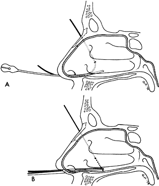 Silicone tube intubation can be performed under local or general anesthesia. In either case, the nasal mucosa and inferior turbinate are vasoconstricted with combined pediatric oxymetazoline hydrochloride (Afrin) and pediatric Neo-Synephrine 1/8% nasal sprays. The lacrimal punctum is gently dilated to allow passage of the Crawford probe and olive tip. In some patients, a small one-snip procedure is performed to allow easy entry and passage of the lacrimal probe and silicone tubing. The probe is lubricated with an ophthalmic antibiotic ointment and passed first vertically through the lower punctum into the lower canalicular system. With the lower lid held on stretch to avoid kinking of the canaliculus, the probe is then rotated 90 degrees so that it is in the horizontal plane. The probe is then advanced nasally until it enters the lacrimal sac and encounters the medial orbital wall. It is then rotated 90 degrees vertically, angled 15 degrees posteriorly, and advanced down through the nasolacrimal duct. The probe exits from underneath the inferior turbinate, normally at the junction of the anterior and middle thirds of the undersurface of the turbinate (Fig. 17). With the aid of a nasal speculum and a fiberoptic headlight, the surgeon should visualize the olive-tipped probe exiting from under the inferior turbinate. It is helpful for the surgeon to stand on the patient's left when visualizing the extreme lateral inferior portion of the right nasal cavity to locate the lacrimal probe. The surgeon should engage the Crawford probe with the Crawford hook. Withdrawing the lacrimal probe slightly should allow the olive tip to engage snugly within the hook. The entire Crawford probe is then withdrawn from the nose. A similar maneuver is used to intubate the upper eyelid canaliculus, leading into the lacrimal sac and nasolacrimal duct. Direct visualization of the lacrimal probe avoids unnecessary manipulation or “raking” maneuvers along the nasal mucosa.