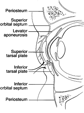 Fig. 1. The superior orbital septum extends from the periosteum of the orbital rim to the levator aponeurosis. In the lower lid the orbital septum inserts along the inferior edge of the tarsal plate.