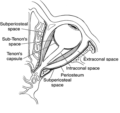 The orbit is lined with periosteum, which is loosely adherent to bone anteriorly and much more firmly adherent posteriorly. The periosteum of the superior orbital rim is continuous with the superior orbital septum, which inserts into the levator aponeurosis (Fig. 1) The periosteum of the inferior orbital rim is continuous with the inferior orbital septum, which inserts along the inferior border of the inferior tarsal plate. The orbital septum is a thin and often incomplete structure rather than a dense continuous membrane.2,3 The intermuscular septa, lateral extensions of the extraocular muscle sheaths, extend from one rectus muscle to the next and from the insertions of the muscles to their origins at the annulus of Zinn posteriorly. Thus, the four rectus muscles and their intermuscular septa establish an anatomic cone that divides the orbit into intraconal and extraconal compartments (Fig. 2). In the posterior orbit, the fascia between the rectus muscles is thin and often incomplete, and distinct compartments may be lacking. Orbital abscesses located within the orbit but outside of the subperiosteal space can easily extend between the intraconal and extraconal orbital spaces.
