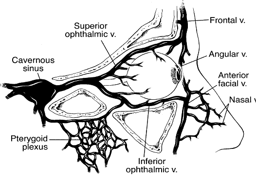 The orbital veins are without valves, and therefore may allow passage of infectious processes in both anterograde and retrograde directions. The venous drainage of the middle third of the face and of the paranasal sinuses is mostly via the orbital veins, and then inferiorly into the pterygoid plexus, or posteriorly into the cavernous sinuses (Fig. 4). A septic process of the cavernous sinus may involve any of the structures located within, including cranial nerves III, IV, V, and VI; the internal carotid artery; and orbital sympathetic nerves (Fig. 5). Such an infection can also extend to the contralateral cavernous sinus, to the pituitary gland, the surrounding meninges, and the parameningeal spaces.7
