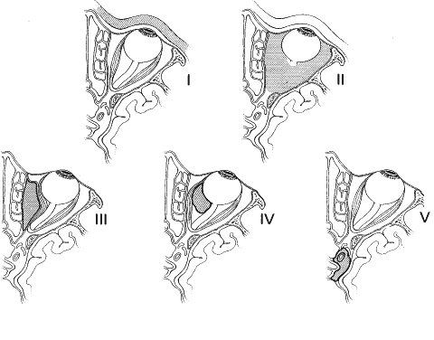 Fig. 6. Chandler's classification of the orbital complications of acute sinusitis. Group I is preseptal cellulitis, and group II is orbital cellulitis. The remaining groups are all abscesses: group III is subperiosteal abscess, group IV is intraorbital abscess, and group V is cavernous sinus thrombosis (septic abscess).10