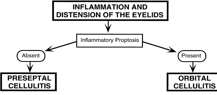 The first step in determining the differential diagnosis of eyelid inflammation is to evaluate the signs of lid tissue distention: when absent, the diagnosis is usually blepharitis or dermatoblepharitis; when present, the diagnosis most often is either preseptal cellulitis or orbital cellulitis (Fig. 7). There is often some overlap between dermatoblepharitis and preseptal cellulitis. The second step involves distinguishing the two latter conditions from each other: absence of proptosis indicates preseptal cellulitis; its presence indicates orbital cellulitis (Fig. 8). A careful ophthalmologic examination is essential, including visual acuity, evaluation of the ocular adnexae and regional lymph nodes, pupil reaction, ocular motility, visual fields, biomicroscopy of the anterior segment, tonometry, and ophthalmoscopy. The ocular examination should be as complete as the clinical setting permits. The most distinctive features of orbital cellulitis are proptosis and limitation of ocular motility; useful but variable additional signs are conjunctival inflammation with chemosis, orbital pain, reduced visual acuity, and afferent pupillary defect (Table 1). If the clinical signs suggest preseptal cellulitis, the third step is to search for two principal risk factors: (1) trauma and (2) infection of the skin of the eyelids or face (Fig. 9). Absence of both suggests the unique entity of nonsuppurative preseptal cellulitis.16,17