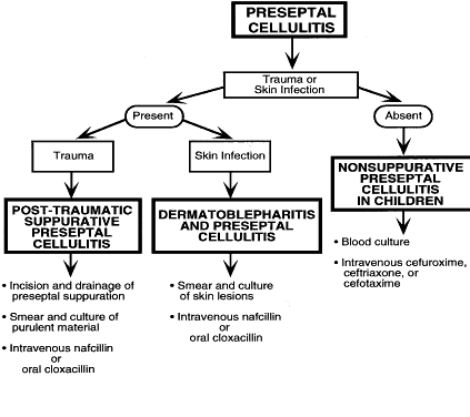 In post-traumatic infections, an entry wound can usually be identified. Preseptal cellulitis can be caused by seemingly minor trauma (e.g., a mosquito bite) or by blunt trauma. Abscess formation in the preseptal space is typically caused by Staphylococcus aureus or Streptococcus pyogenes. When an abscess is identified, management usually requires surgical drainage, smear and cultures of the material thus obtained, and initiation of appropriate antibiotic therapy (e.g., intravenous [IV] nafcillin, oral dicloxacillin) unless otherwise directed by interpretation of the Gram's stain or by other factors.