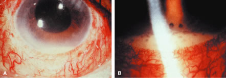is intact, although it is markedly thinned (Fig. 4A). Some patients with phacolytic glaucoma exhibit conjunctival injection. The large cells present in the anterior chamber are mostly mononuclear phagocytes containing lenticular material. These macrophages accumulate on the lens capsule and clog the trabecular meshwork, thereby causing an elevation in intraocular pressure15 (see Fig. 4B). The diagnosis can be established by paracentesis of anterior chamber fluid and examination of the material for macrophages laden with lens material. The treatment of phacolytic glaucoma consists of reduction of intraocular pressure by acetazolamide and/or hyperosmotic agents, followed by surgical removal of the entire lens. Most patients respond well to this approach, but the patient with angle recession combined with phacolytic glaucoma may require long-term topical or systemic antiglaucoma therapy following extraction of the lens. |