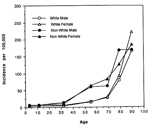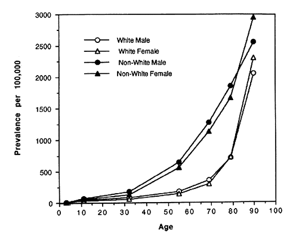 In spite of these problems and until recently, blindness registries have been the best source of national data on rates and causes of blindness in the United States. In the 1960s and 1970s the National Eye Institute and its predecessor, the National Institute of Neurological Diseases and Blindness developed the Model Reporting Area for Blindness Statistics project, a voluntary association of 16 states' registries that agreed to standardized definitions of blindness and uniformity of recording procedures.5,6 The last report of this project was published in 1973 and included data from 14 of the 16 participating state registries. Figures 1 AND 2 AND Table 1 summarize a number of the key findings from that report. Blindness registration prevalence and incidence were strongly associated with age. Rates were 37 to 227 times higher among those in the oldest age group as compared with the youngest (see Figs. 1 AND 2).Both prevalence and incidence of registration were consistently higher among nonwhites as compared to whites with an age-adjusted prevalence ratio of 2.65 and a relative risk of 2.37 (see Table 1). There was an indication that rates were slightly higher among women compared to men; however, it was not consistent across different age groups. Table 1 also demonstrates that, while overall age-adjusted rates were approximately twice as high among nonwhites compared to whites, the rate of glaucomatous blindness registration was eight times higher suggesting that nonwhites either have higher rates of glaucoma, progress to blindness more rapidly, or were even more likely to register as blind than those nonwhites who were blind from other causes.