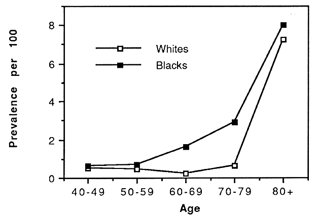 Fig. 3. Prevalence of blindness by age and race, Baltimore Eye Survey. (Tielsch JM, Sommer A, Witt K et al: Baltimore Eye Survey Research Group: Blindness and visual impairment in an American urban population. Archives of Ophthalmology 108:286, 1990. Copyright © American Medical Association, Chicago, IL, 1990)