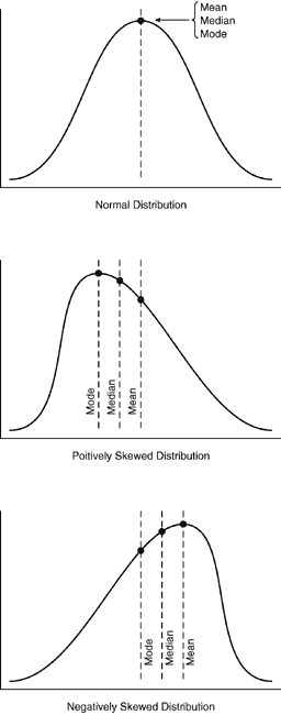 The median is defined as the middle value when the numbers are arranged in either ascending or descending order. When the distribution of data contains extreme values, the median often is a better indicator of the central tendency. The mode, on the other hand, is the value that occurs most often. All of these measures of central tendency indicate the overall shape of the distribution curve. When the mean, median, and mode all share the same value, then the resulting curve is said to be perfectly symmetric. Conversely, if the curve is skewed to the left or right, the mean, median, and mode values also are skewed to the left or right, respectively (Fig. 1).