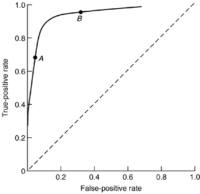 ROC curves originally were developed to measure the signal-to-noise ratio of early radio transmitters and have been adapted in the field of epidemiology to measure the true-positive values detected using the diagnostic test versus the false-negative values also picked up using the same diagnostic test. Thus, the ROC curve is a graph of the sensitivity (true-positive rate) to the false-positive rate. As shown in Figure 2, the closer the ROC curve is to the upper left-hand corner of the graph, the greater the accuracy of the test, since the true-positive rate is 1 and the false-positive rate is 0. Thus, as the values for a positive test become greater, the point on the curve corresponding to sensitivity and specificity (denoted by point A) decreases and moves to the left (i.e., lower sensitivity and higher specificity). Conversely, if fewer data are needed for a positive test, the point on the curve corresponding to sensitivity and specificity (denoted by point B) moves up and to the right (i.e., higher sensitivity and lower specificity). Last, the diagonal line drawn from the origin in Figure 2 represents a test with a positive or negative result purely by chance alone.