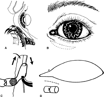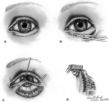 factors. INVOLUTIONAL ECTROPION Involutional ectropion evolves slowly secondary to eyelid laxity and tractional forces of the anterior lamella. This may result from mild cicatricial changes of the skin or orbicularis muscle or a mechanical or gravitational eversion of the eyelid margin. There is generally a progression from eyelid laxity to punctal ectropion, medial ectropion, and then generalized ectropion. If the punctum is slightly everted from the lacus lacrimalis, tears cannot effectively drain into the canalicular system. In addition, the siphoning effect of the lacrimal excretory system, as demonstrated by Doane,15 is not generated if the lacrimal puncta do not occlude on lid closure and do not approximate the lacus lacrimalis. With the puncta approximated, attempted eyelid opening creates negative pressure within the lacrimal excretory system. When the puncta initially separate, the negative pressure siphons tears from the lacus lacrimalis. Also, horizontal eyelid laxity may produce a flaccid canalicular syndrome or poor lacrimal pump, so that tears are not siphoned from the lacus lacrimalis.16 This tearing malfunction is aggravated by the chronic ectropion and eyelid retraction that produce lagophthalmos and secondary exposure keratopathy. With time, the exposed conjunctive thickens and keratinizes, producing further ocular irritation. Mild medial ectropion is manifested by rotation of the punctum away from the ocular surface causing mild tearing. This can be treated with a one- or two-snip punctal plasty, establishing anatomic continuity between the canalicular system and lacus lacrimalis in the medial canthal angle. This procedure is performed by opening the punctum and vertical canaliculus with a single snip of a sharp iris or Westcott scissors or by excising a very thin “V” wedge (two snips). This procedure may also be helpful after ectropion repairs if a mild eversion of the puncta remains. This can be performed as an office procedure. A cotton-tipped applicator saturated with 4% lidocaine solution held over the punctum and adjacent palpebral conjunctiva usually provides adequate anesthesia. If it does not, a 30-gauge hypodermic needle can be passed through the punctum and vertical canaliculus so that 1% or 2% lidocaine can be infiltrated into the pericanalicular tissue. Medial ectropion, when more severe, may require surgical intervention. Surgery directed at the lateral canthal angle, as discussed later in this chapter, does not fully alleviate medial lid malpositions, and this approach is not universally successful in restoring eyelid position. Removal of a conjunctival and lower lid retractor spindle may be necessary. The spindle is directly beneath the tarsus with its long axis directly parallel to the eyelid margin (Fig. 3). The conjunctival retractor spindle should measure no more than 5 mm in a vertical dimension, to prevent postoperative retraction and entropion resulting from posterior lamellar shortening. In essence, the closure of this internal lamellar resection creates a direct tightening of the medial lower lid retractors. Full-thickness lid sutures tied over a firmly rolled cotton or silicone bolster have been described by Collin.17 Although this technique is a short-term nuisance for the patient, it does result in a superior inward rotation of the punctum and lid margin without retraction. For cases of prominent medial ectropion, the Byron Smith “Lazy T” procedure combines a horizontal lid-tightening procedure with a lower lid retractor resection.18 This combined procedure inverts the eyelid margin to its appropriate anatomic position. Full-thickness eyelid resections and repairs have been poorly demonstrated and reported in the ophthalmology and plastic surgery literature. The concept of a wedge resection or pie-shaped tarsal resection should be totally discarded. In its place, full-thickness modified pentagonal block resections should be used (Fig. 4). Incision through the eyelid should be perpendicular to the lid margin. If the eyelid resection is wedge shaped, the repair or approximation of the lid results in a notch or valley of the eyelid margin at the incision site. The layered repair of the lid margin defect should start with approximation of the tarsus. Adequate tarsal approximation provides the foundation for lid reconstruction and removes all tension from the eyelid margin. As a result, lid notches or trichiasis should be almost nonexistent. The initial interrupted sutures should be placed through the base or inferior border of the tarsus to promote tension-free lid approximation (see Fig. 4A, suture a). The first suture for tarsal approximation is a 5-0 or 6-0 polydioxamone (PDS) or polyglactin (Vicryl) with a spatula-style needle. If excessive lid tension is evident, a 5-0 suture is preferable. The PDS is an absorbable suture that retains its tensile strength for 6 weeks and promotes little tissue reaction. Vicryl is also an absorbable suture that retains its tensile strength for 3 to 4 weeks. It may be more prone to cause tissue reaction in some patients. Horizontal approximation of the cut edges of the lower lid retractor with interrupted 6-0 PDS sutures may also help to reduce horizontal lid tension. Continuous running sutures through the lower lid retractors from the inferior aspect of the modified pentagonal lid resection to the base of the tarsus result in a downward traction of the eyelid resulting from vertical shortening of the lid retractors and should be avoided.19 To avoid a suture that is tied at the lid margin, a superior tarsal suture is initiated on the anterior tarsal surface approximately 2 mm from the cut edge of the tarsus and 2 mm inferior to the lid margin (see Fig. 4A). The suture is then angled to exit the cut surface of the tarsus at the posterior lid margin. The opposing suture is then placed from the posterior lid margin to exit the tarsus at 2 mm from its cut edge and 2 mm from the lid margin. Tying this sutu