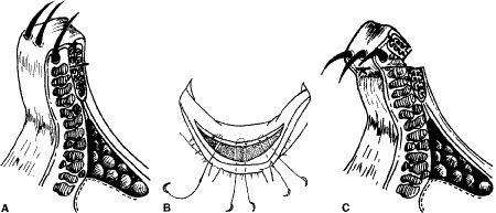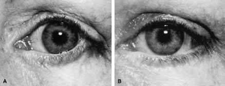 If medial canthoplasty is necessary to facilitate lid elevation or to narrow the palpebral fissure, a variation of the standard procedure is helpful to minimize horizontal lid narrowing. Traditionally, medial canthoplasties involve direct approximation in the medial canthal angle in which the medial eyelid is zippered closed.37 This results in a horizontally narrowed palpebral fissure, with minimal elevation of the retracted lower eyelid. A medial canthoplasty is more effectively performed by supporting the lower lid with the superior crus of the medial canthal tendon (Fig. 11). This is accomplished by the approximation of a lateral portion of the lower medial canthal angle to a more nasal portion of the upper medial canthal angle (see Fig. 11B). The nasal portion of the eyelid is then supported by the superior crus of the medial canthal tendon. The lower eyelid thereby assumes a higher position with minimal horizontal narrowing of the palpebral fissure. Often, the upper eyelids require surgical intervention to minimize lagophthalmos in patients with facial paralysis. In most texts that deal with eyelid malpositions, the upper eyelid is unfortunately neglected in this discussion. Many procedures have been advocated to minimize lagophthalmos. These procedures include temporalis muscle transfer, upper eyelid weights, stainless steel springs, eyelid magnets, and the fil d'Arion procedure. All of these operations have extensive complications. Lid-loading (eyelid weight) procedures had been discouraged in the treatment of lagophthalmos secondary to facial palsy and orbicularis muscle paralysis, primarily because of the high rate of extrusion of implanted devices. Kelly and Sharpe38 reported an extremely high complication rate of 68% in paralytic eyelids following gold weight implantation. Complications included extrusion (43%), migration (18%), and infection (7%). Gold weight implantation has been re-evaluated and is extremely effective in minimizing lagophthalmos.39,40 The high incidence of complications was a result of improper gold weight implantation techniques. The gold weight procedure can be regarded as re-animation by gravitation. May39 re-evaluated lid-loading procedures and greatly improved surgical techniques, almost eliminating complications. May recognized that the main disadvantage of traditional loading procedures was the superficial placement of the weight. A muscular pocket could not support the gold weight, allowing migration and extrusion. In the eyelid, the orbicularis muscle fibers easily separated, and the thin, delicate eyelid skin then became the sole barrier to extrusion. Complications have been dramatically reduced by deeper weight fixation within the eyelid. A small pocket is created by elevating the levator aponeurosis from the tarsus and Müller's muscle (Fig. 12). The gold weight is then sutured to the superior tarsal border and undersurface of the levator aponeurosis and migration and extrusion are virtually eliminated. Also, deep fixation of the gold weight minimizes deformity of the upper lid and will only be apparent in those patients with a sunken superior sulcus. The size of the gold weight is determined preoperatively by taping the weight onto the eyelid and observing the lid closure. Lid closure must be ensured without inducing ptosis from an excessive weight. The most frequently used weights are 1 g and 1.2 g. It should be noted that the gold weight will allow prolonged lid closure but will not recreate the spontaneous blink reflex. Spring implantation is a much more difficult procedure with a high rate of extrusion, but this does provide a more spontaneous blink.35 Part of the benefit of upper lid gold weights comes from the elimination of upper lid retraction caused by upper lid retractors working in the absence of normal opposing orbicularis oculi muscle protractor tone. The creation of a very mild upper lid ptosis can further protect against the corneal irritation caused by incomplete spontaneous blinks and incomplete voluntary closure. Müller's muscle excision to lower the upper lid position can improve the symptoms and corneal surface integrity of facial palsy patients even without implantation of a gold weight.41 FLOPPY EYELID SYNDROME Floppy eyelid syndrome was first described by Culbertson and Ostler in 1981.42 This is a condition most often seen in overweight males. There is significant laxity of the eyelid tissues. It is generally bilateral but may be asymmetric. Retraction of each eyelid leads to its eversion. Ophthalmologically, this condition shows some thickening of the tarsal plate along with low-grade chronic inflammation that may be seen in any of the lid tissues. No specific etiologic factor has been determined.43 There is a high correlation of obstructive sleep apnea in patients with the floppy lid syndrome.44 Perhaps there is some type of connective tissue disorder. However, overweight men are also at more risk for developing sleep apnea. Patients with floppy eyelid syndrome may experience spontaneous eyelid eversion. This was the initial presenting symptom that drew attention to the problem. It is more likely to occur on the side on which a patient sleeps. This is typically the most severely involved side in asymmetric cases. There is also eyelid imbrication in which the lax upper lid rides over the margin of the lower lid on eyelid closure.45 The leads to a chronic irritation of the tarsal conjunctiva of the upper lid. Typically, there is a thickening of the upper lid with erythema and chronic papillary conjunctivitis. Ocular lubricating ointments and corticosteroids can help decrease some of the inflammation that occurs and antibiotics can control secondary infections. However, horizontal eyelid shortening of the upper and sometimes also the lower lids can produce a more lasting improvement.46,47 These eyelids are often extremely lax and fairly large horizontal resections are necessary to restore appropriate horizontal tension to