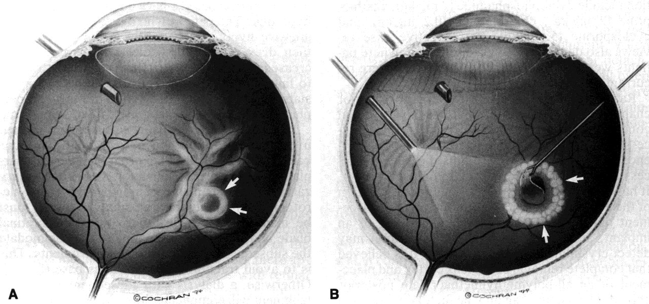 to prevention or treatment. Chorioretinal endobiopsy has been described in and recommended for those patients with sight-threatening chorioretinitis that is unrelenting and unresponsive to therapy. Usually, the agents selected for treatment are based on the clinical appearance and suspected etiologic cause of the posterior necrosis. Occasionally, an atypical appearance, an unusual clinical course, or an immune-altered host requires tissue inspection, cultures, and further tissue testing in an attempt to diagnose the problem more precisely. A rational therapy can be instituted based on a biopsy specimen. Internal pars plana vitrectomy approaches to this procedure have been described and referenced above. As shown in Figure 1, a standard three-port vitrectomy is used. If the attached retina is affected, such as in retinitis, a relatively avascular site 3 mm in size is chosen, if possible in the superior quadrants. Unimanual bipolar endodiathermy is applied to the full thickness of the chorioretinal layer. The specimen is removed as a button from the underlying sclera through a pars plana sclerotomy. Additional endolaser is placed around the edges of the biopsy site. After hemostasis is achieved with additional endodiathermy, an air-fluid exchange is done. The eye is then flushed with a long-acting, nonexpansile gas mixture.6 Immediate attention should be directed to processing the specimen. Every effort should be made to have the pathologist in the operating room to receive the specimen. |