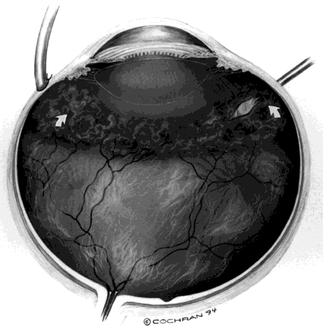 of closure of laser iridectomies by inflammatory debris or pigment. Formation of cataracts is often the result of a chronic inflammatory disturbance of the lens. Chronic use of corticosteroids adds its own cataractogenic influence. The result is a patient with cataract lens opacities that play a role in what is often decreased vision based on this and other problems. The discussion of isolated cataract removal is to follow. Cataracts in patients with posterior uveitis often exist with vitreous opacities, macular edema, or macular cellophane membranes or macular pucker. The combination of pars plana vitrectomy with cataract extraction not only clears the visual axis but may reduce the severity and incidence of recurrences of inflammation. Recent series in the literature support this. Each series has emphasized the need for preoperative control of inflammation by use of topical and periocular corticosteroids with several repeated injections if necessary, usually 2 to 3 weeks apart, and oral nonsteroidal anti-inflammatory medicines. The patient may need oral corticosteroids or immunosuppressive therapy. Drugs reported in the literature that are used in the preoperative control of inflammation include cyclophosphamide (2 mg/kg), azathioprine (2 mg/kg), chlorambucil (0.2 mg/kg), and cyclosporine (5 mg/kg). Retrospective case reviews also demonstrated case selection, where patients were not operated on if they had severe recurrent inflammation.13–23 Rationale for the decision to implant posterior chamber intraocular lenses continues to grow, and conditions in which this has been performed successfully continue to be defined by recent experience and publications. Care must be taken to access the stability of the capsular zonular strength. It has been reported that inflammatory destruction of the zonules may lead to intraoperative displacement during the placement or positioning of an implant, and that preoperative examination may detect crystalline lens subluxation.24 It is believed that complete removal of the lens cortex and placement of an all-polymethylmethacrylate posterior chamber lens in the bag may be factors in reducing postoperative inflammation. Phacoemulsification, planned extracapsular extraction, and ultrasonic fragmentation via the pars plana have all been successfully used to remove the lens in these patients. Surgeons have reported complications in uveitis patients even after technically ideal cataract surgery with or without posterior chamber lens implantation. Visual rehabilitation is limited by cystoid macular edema, pupillary membranes, dense capsular opacities, postoperative hemorrhage from abnormal iris vasculature, hypotony, and chronic postoperative inflammation. Aggressive medical control of the inflammatory process is repeatedly suggested as an adjunct to improved visual outcome. The underlying destructiveness of the inflammatory process and the natural history of the disease should be considered in selecting patients for cataract extraction and intraocular lens implantation. First, as previously mentioned, pars plana vitrectomy can be done in combination with cataract extraction, or it can be done to clear vitreous debris. Second, in several published studies, vitrectomy has been observed to lessen the frequency and severity of recurrences of inflammation. These studies have included patients with intermediate uveitis and chronic posterior uveitis.25–27 Third, patients with iris bombé and initially elevated intraocular pressure who do not respond adequately to medical and anti-inflammatory management may require mechanical clearing of the pupillary and retropupillary space. Lastly, advanced vitreoretinal surgical procedures may be needed to repair complex tractional detachments of the retina that may be combined with a rhegmatogenous component or an associated ciliary body detachment with hypotony. The patient who develops chronic progressive hypotony is usually in the end stage of their disease. When medical measures fail to increase intraocular pressure, the cause is attributed to failure of the ciliary body. These eyes may be stabilized for an extended period of time with pars plana vitrectomy and a complete fill of silicone oil. In patients with vitritis as a component of their uveitis, organization and fibrosis of the vitreous base area can occur. This often includes the pars plana area. Dense organization and neovascularization of the pars plana occur in pars planitis. Sclerotomy at the time of pars plana vitrectomy must be made with a fresh, sharp microvitreoretinal blade and must be large enough to accommodate the subsequent passage of other instruments. This is to avoid traction on the vitreous base (Fig. 2). Otherwise, a dialysis with subsequent retinal detachment will complicate the surgery. Cryotherapy of the sclerotomy sites at the conclusion of surgery may help to prevent postoperative retinal detachments from a break in this area. The combination of external cryotherapy of the pars plana and vitrectomy in pars planitis patients has been reported to be complicated by giant retinal tears presumably at the edge of the cryotherapy.27 Retinal detachment in eyes with uveitis may be due to an isolated rhegmatogenous mechanism or a combined traction-rhegmatogenous mechanism. Posterior vitreous separation caused by vitreous inflammation can lead to retinal breaks and cause retinal detachment. Often the retina can be reattached with a scleral buckling procedure. If there is significant vitreous opacity, vitrectomy and scleral buckling may be required to reattach the retina. Fibrous or even fibrovascular proliferation associated with uveitis can cause or complicate retinal detachment. Pre-existing epiretinal membranes present before retinal detachment can lead to fixed folds and a picture of proliferative vitreoretinopathy after retinal detachment, whether retinal breaks and retinal detachment are a result of the epiretinal membranes or not. In addition, the