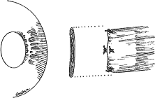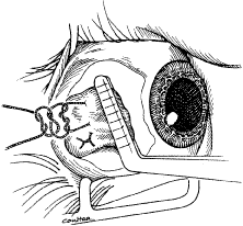 A Castroviejo caliper is used to mark a point on the sclera at a predetermined distance from the posterior portion of the muscle insertion (Fig. 31). Some surgeons prefer to mark the sclera the using the limbus as a reference point. These surgeons believe that it is more accurate to measure from the limbus than from the insertion of the rectus muscle because the insertion may have some anatomic variation. If a large recession procedure will be performed, measurement from the limbus will introduce a cord effect that will increase the amount of recession achieved (Fig. 32). To reduce this effect, William Scott has designed a curved ruler that provides a more accurate measurement of the arc. It is important for the surgeon to be careful and consistent with the measurement technique so that the effect of the surgical procedures can be critically evaluated. The needle is grasped with a locking Barraquer needle holder at the middle portion of the shaft. Grasping the S wedged portion of the needle can cause the needle to roll within the jaws of the needle holder and this can increase the risk of penetration of the sclera. At the mark created by the caliper, there is usually a small dimple or depression in the sclera. The mark results from expressing water from the sclera so that the blue color of the uvea is seen. Because the muscle will attach to the globe at the point at which the needle tip enters the sclera, care is taken to start the intrascleral needle pass at the point marked by the caliper (Fig. 33). Care should be taken not to introduce any unintentional supraplacement or infraplacement effect of the tendon at the new insertion. The width of the insertion should be preserved: The width of the new insertion should equal the width of the original insertion. If the width of the insertion is not preserved, the muscle will not pull up to the new insertion evenly (Fig. 34A and B). If there is a sag in the new insertion caused by the new insertion site being too narrow, the suture can be passed back through the insertion to pull the center of the sagging muscle tendon back to the insertion (Fig. 35). The fine wire needles need to be passed following the curvature of the needle tip. Attempts to elevate the tip of the needle while it is in the sclera can cause the needle shaft to bend (Fig. 36A and B). Some surgeons advocate a “crossed-swords technique” so that the second needle pass does not cut the suture from the first needle pass. With appropriate magnification, the other end of the suture is easily avoided. Once the needles have been passed through the sclera, the muscle is pulled up to its new insertion (Fig. 37). A Stevens' hook is used to keep the Tenon's and other surrounding tissue from being drawn into the insertion. The synthetic absorbable sutures tend to drag Tenon's tissue when the suture comes in contact with this tissue. Coating the suture tends to minimize this problem but does not completely eliminate it. The muscle is tied with a surgeon's (double throw) knot that is further secured with two or three square knots. The new insertion is checked and measured to verify that the muscle is in the desired position. After the measurement is checked, the locking Castroviejo forceps are removed. The conjunctival edges of the wound are repositioned or swept closed with a muscle hook. The wound is not sutured. After the procedure, we do not use ointments or occlusive dressings. A drop of an antibiotic-steroid solution can be applied at the discretion of the surgeon. RESECTION PROCEDURE: FORNIX INCISION This procedure is a resection of a lateral rectus muscle. The approach to the rectus muscle to be resected is similar to that of the recession. The limbus is grasped with a Lester forceps. The globe is rotated up and away from the muscle to be resected. The conjunctiva is incised, and the rectus muscle is grasped with a Stevens' hook that is replaced with a Jameson hook. The Tenon's tissue and intermuscular septa are cut and reflected onto the Jameson hook. The intermuscular septa are cut with a Westcott scissors. The rectus muscle tendon is then suspended between the Jameson muscle hook (Fig. 38).