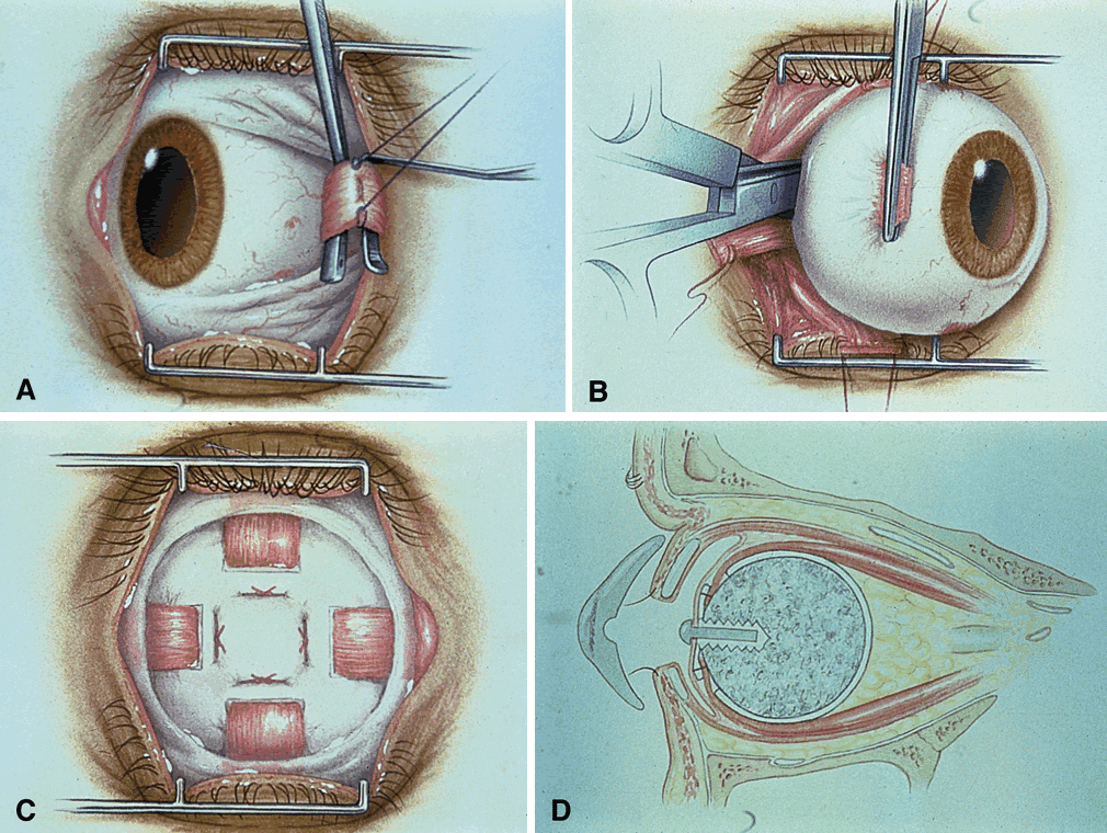 methods of treatment.11 INDICATIONS Enucleation probably is indicated for all unilateral cases in which the tumor fills most of the globe and in which there is little hope of salvaging any viable retina or useful vision (Fig. 1). If half of the retina is free from tumor, then other methods of treatment can be considered, as long as parents have been fully informed as to the possibilities of metastasis, the complications of treatment, and the risk for ultimate enucleation. Other indications for enucleation include the presence of neovascular glaucoma in an eye with retinoblastoma and the suspicion of optic nerve, choroidal, or orbital tumor extension. Seeding of retinoblastoma onto the pars plana or into the anterior chamber are important findings that often lead to enucleation. In bilateral cases, the eye with the most advanced tumor traditionally has been enucleated and the less involved eye managed with irradiation or other methods. If the most advanced eye has sparing of more than half of the retina, an attempt can be made to salvage both eyes with treatment. If both eyes have far-advanced tumors and there is no hope of any vision, bilateral enucleation may be necessary. Trying chemoreduction, bilateral external beam irradiation, or both with close follow-up may be justified if the parents are fully informed and refuse bilateral enucleation. TECHNIQUE The technique of enucleation for retinoblastoma is slightly different from the standard enucleation performed by most ophthalmic surgeons.12,13 Since retinoblastoma is a loosely cohesive malignant tumor and the scleral wall in these young children can be thin, precautions should be taken to be extremely gentle during the procedure. A lateral canthotomy can be performed first if the child has a small, tight orbit. A peritomy is made for 360° at the limbus. Tenon's fascia is separated between the rectus muscles. If the surgeon is not placing a motility implant, then the procedure is as follows (Fig. 2). The rectus muscles are individually gently hooked and cut with scissors near their insertion onto the sclera. The inferior and superior oblique muscle are sequentially hooked with two muscle hooks, clamped, and cut. If the surgeon is placing a motility implant such as hydroxyapatite or13 polyethylene, then the technique is as follows. The rectus muscles are sequentially isolated on muscle hooks and tagged with double-armed 5-0 vicryl sutures near their insertion and cut at the insertion. The oblique muscles are isolated and cut without tagging. Orientation of the muscles and their respective sutures should be accurate. The next step is cutting the optic nerve. Since the main route of extension of retinoblastoma is through the optic nerve and subarachnoid space, it is advisable to obtain as long a section of optic nerve as possible at the time of enucleation. This can be accomplished by placing a hemostat on the stump of the severed medial rectus muscle for traction. This permits the globe to be gently pulled forward, stretching the optic nerve when it is cut deep in the orbit. A firm grip with a hemostat provides better traction than silk sutures placed through the muscle insertions. By using this technique, the globe can be removed intact, and a long section of optic nerve generally can be obtained. Enucleation scissors with long tips that have a slight curve are better than short scissors with a sharp curve for obtaining a sizable section of optic nerve. Snares or clamps on the optic nerve are not recommended, since they induce more trauma and can produce crush artifact in the optic nerve. This can lead to difficulty for the pathologist in differentiating meningothelial cells from crushed retinoblastoma cells. The optic nerve is cut and the eye removed. The socket is compressed with gauze until adequate hemostasis is obtained. An appropriately sized implant measuring 18 to 20 mm in diameter is placed in posterior Tenon's capsule. If there is a standard ball implant, then the horizontal rectus muscles along with overlying Tenon's capsule are tied horizontally to each other, and the vertical rectus muscle and Tenon's capsule are then tied vertically to each other. If there is a motility implant, then the four rectus muscles are attached with anatomic orientation to the implant. The cut rectus muscles are pulled through windows that have been cut in the scleral wrap, covering the implant. Currently, we use the hydroxyapatite orbital motility implant, and it is wrapped with betadine-soaked sclera13 or prepared bovine pericardium. Closure of the socket includes 5-0 vicryl sutures placed in an interrupted vertical fashion in the deep and superficial layer of Tenon's capsule. The conjunctiva is closed with running 5-0 vicryl sutures. A conformer is placed between the lids and the conjunctiva. Antibiotic ointment is instilled, and an absorbent pressure patch is applied for 24 hours. In 6 weeks, the patient visits an ocularist for permanent prosthesis fitting. Motility implants can provide remarkable prosthesis movement. In some cases, a peg can be placed into the motility implant to improve coupling of the movement of orbital implant with the prosthesis. The peg placement generally is delayed for at least 6 months after enucleation to allow adequate fibrovascularization of the implant. In children with retinoblastoma, we generally postpone the peg placement until the teen-age years, when the patient is more cooperative and the procedure can be performed under local anesthesia. Some authors recommend that frozen sections of the optic nerve be performed at the time of enucleation to detect tumor extension.14 Since posterior optic nerve extension is rare in our experience and since histopathologic interpretation can be difficult, we do not routinely perform frozen sections in such cases. However, it seems reasonable to consider frozen sections in cases where optic nerve extension is strongly suspected. COMPLICATIONS There are few complications of e