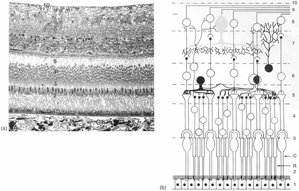 The retina is a very thin, delicate, and transparent membrane, with a surface area of approximately 266 mm2.1–3,97,121,122 It is loosely attached to the choroid via the pigment epithelium. The retina consists of two distinct layers: the neurosensory retina and the retinal pigment epithelium. These two layers extend over the inner surface of the eye from the optic disc posteriorly to the ora serrata anteriorly, where the retinal pigment epithelium becomes continuous with the pigmented epithelium of the ciliary body and the neurosensory retina becomes continuous with the nonpigmented epithelium of the ciliary body. The retinal layers are thickest at the optic disc, measuring 0.56 mm in thickness.123 Peripherally, the retina thins so that at the equator it is 0.18 mm in thickness and at the ora serrata it is 0.1 mm in thickness. The major topographical landmarks of the retina include the optic nerve head, the area centralis, the peripheral retina, the retinal vasculature, and the ora serrata (Fig. 19). The optic nerve head is just nasal to the posterior pole of the eye. Its edge is located approximately 3.42 ± 0.34 mm from the foveola. The optic disc has an average vertical diameter of 1.86 ± 0.21 mm and an average horizontal diameter of 1.75 ± 0.19 mm. Here, all the layers of the retina terminate, with the exception of the nerve fiber layer. The inner layer of the retina terminates before the outer layers, both of which are separated from the optic disc by a thin layer of glial cells called the intermediary tissue of Kuhnt (Fig. 20). The area centralis (macula) is subdivided into the fovea with the central foveola and the surrounding parafovea and perifovea. It is located in the posterior fundus, temporal to the optic disc, and bounded by the superotemporal and inferotemporal retinal vascular arcades. It is elliptical in shape, with its long axis oriented horizontally, and has an average diameter of 5.5 mm, which corresponds to approximately 15 degrees of the central visual field. The macula lutea represents a yellow zone around the fovea. It is horizontally oval, with a diameter of approximately 3 to 5 mm, depending on the method of observation. The yellow color of this zone may be caused by the presence of xanthophyll pigment in the bipolar and ganglion cells in this area. The foveola represents a focal concave depression, where the retina is thinner, and marks the center of the area centralis. It is located approximately 4 mm temporal and 0.8 mm inferior to the center of the optic disc. The average thickness of the foveola as measured by ocular coherence tomography and scanning retinal thickness analyzer ranges from 108 to 178 μm.124,125 It is 0.35 mm in diameter and 0.25 mm in depth. This area subtends 1 degree of the centermost visual field and represents the area of the sharpest visual acuity. This is because of the high density of cone cells, absence of rod cells, avascularity, and peripheral displacement of the inner layers of the retina. This displacement of the inner retina creates the downward slope called the clivus, which meets the floor of the foveola. The optical reflectance is formed by the inner limiting membrane by the concavity of the foveola and the radius of curvature is formed by the clivus decreases significantly with age.126 The inner nuclear layer, inner plexiform layer, ganglion cell layer, and nerve fiber layer are absent in the foveola. The fovea surrounds the foveola and has a diameter of 1.85 mm, which corresponds to the central 5 degrees of the visual field. The average thickness of the retina in this area is 0.25 mm. The foveal avascular zone measures approximately 0.4 mm in diameter. The entire vascular supply to the fovea is via the choriocapillaris. The parafoveal central retina is an annular zone 0.5 mm in width, and along with the fovea, measures 2.5 mm in diameter. It contains the largest number of nerve cells in the entire retina. The thickness of the photoreceptor layer in this portion of the retina is 40 to 45 μm. There are 100 cones per 100 μm2 in this area. The perifoveal central retina or near peripheral retina measures 1.5 mm in width beyond the parafoveal retina. The outer boundary of this area is 2.75 mm from the foveal center. There are nine to 12 cones per each 100 μm2 in the perifoveal central retina. These cones are surrounded by rods. Henle's fiber is absent in this area. The midperiphery consists of an annular area 3-mm wide surrounding the near peripheral retina. The cones in this area number approximately eight to 10 per 100 μm2. These cones are separated from each other by at least three rods. The far peripheral retina extends in width 9 to 10 mm beyond the midperipheral retina temporally and 16 mm nasally. Ganglion cells in this area are quite large and widely spaced. In this area, there are only six to seven cones per 100 μm2, and they have shortened outer segments. Beyond the far peripheral retina is an anterior fringe of the retina that constitutes the ora serrata. It consists of dentate processes with intervening scalloped-shaped bays and marks the zone where the retinal pigment epithelium and the attenuated neurosensory retina tran-sition into the pigmented ciliary epithelium and the nonpigmented ciliary epithelium of the pars plana, respectively. In this area, cones are poorly developed and replace rods. The rod and cone layers ultimately fuse and the plexiform layer disappears as the area of the ora serrata is approached. Approximately 0.5 mm before reaching the ora serrata, ganglion cells, rods, and the nerve fiber layer cease to be present. The ora serrata is 2-mm wide on its temporal side and 0.7- to 0.8-mm wide on its nasal side, and located approximately 6 to 7 mm posterior to the corneoscleral junction. Cystoid degeneration is often present in the peripheral retina near its termination at the ora serrata in the outer plexiform layer, is more prominent nasally, and becomes more pronounced with age.127 The outer