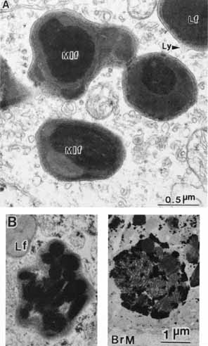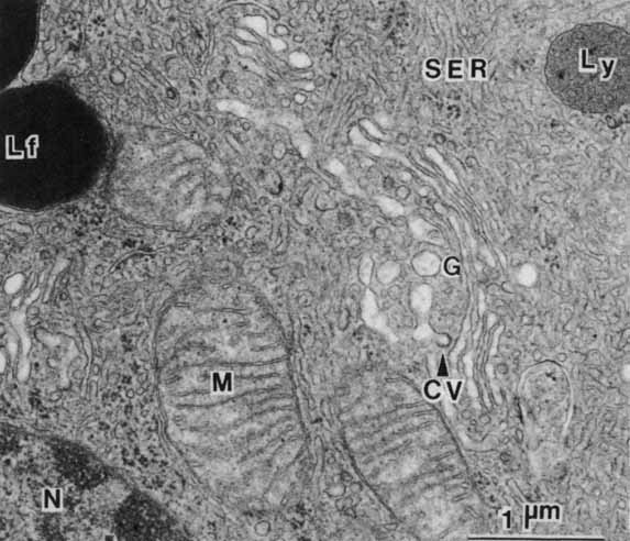RPE cells are brown in color because of the aforementioned melanosomes that are concentrated in the apical portion of the cell. Although the number of melanin granules per cell is the same in macular RPE cells as in equatorial RPE cells, the macular cells are taller and narrower, and the layer of melanin is therefore denser in this region of the fundus. This produces the darker color of the macula, which is further accentuated by the presence of macular pigment in the NR. Although pigmentation of RPE cells was originally considered to function in absorption of stray light, more recent analyses have indicated several additional functions. These include protection against oxidative stress and bindingand/or inactivation of toxic substances.64 Indeed, evidence suggests that melanosomes may play an active role in aspects of RPE metabolism, and may interact with lysosomes in the clearance of bound compounds65 (Figs. 16 and 17). Melanogenesis of RPE cells occurs early in development, and RPE cells are the first cells of the body to become pigmented. The aging RPE gradually assumes a more golden hue because of the accumulation of lipofuscin pigment granules in the perinuclear and basal cytoplasm (see later). Lipofuchsin has long been thought to accumulate in RPE cells as a by-product of processing in lysosomes, membrane-bound organelles whose basic function is the intracellular degradation via acid hydrolases of high-molecular-weight compounds to low-molecular-weight products.35 RPE lysosomes vary considerably in size, from small primary lysosomes to bodies as large as the nucleus, such as secondary lysosomes containing many melanosomes. RPE lysosomes contain enzymes capable of degrading most types of complex biological macromolecules, including nucleic acids, proteins, complex carbohydrates, and lipids.66 Lipofuscin granules are a subset of secondary lysosomes (or residual bodies), defined by their emission of a yellow fluorescence in response to ultraviolet stimulation. In unstained RPE tissues lipofuchsin granules can be distinguished by their lighter hue from melanin granules that accumulate throughout life. In adult RPE the category of lysosomes occupying the greatest area in the cells is the complement of lipofuscin granules, and these gradually accumulate, beginning at the basal aspect of the cells and gradually accumulating to mingle among melanosomes more apically.66,67 Evidence suggests that RPE lipofuscin granules represent residual bodies of the lysosomal system, containing material derived primarily from phagocytosed photoreceptor outer segments. Until recently, the process by which RPE cells form lipofuchsin has been poorly understood, but the underlying biochemical process has now become clearer. It appears that two all-trans retinals combine with phosphatidylethanolamine in photoreceptor outer segments, and this adduct is then taken up by the RPE, and converted to a stable form called A2E (pyridinium bisretinoid), which accumulates in and is toxic to RPE.68,69 While lipofuchsin is found in a variety of cell types, the lipofuchsin pathway is best understood in RPE, and caution must be exercised in extrapolating this process to other tissues.70 |
