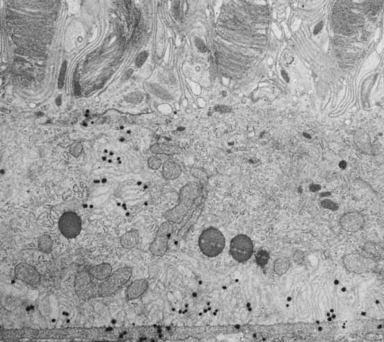 As already discussed, the topography of retinal development results in the intimate association of RPE apical microvilli with rod and cone photoreceptor outer segments across the intraretinal space (Figs. 4 and 6). These are bound together by the interphotoreceptor matrix (IPM), a network of proteins and proteoglycans containing a variety of enzymes, growth factors, carrier proteins, and other constituents.4 A number of constituents of this matrix have been localized in three distinct patterns, such as those that demonstrate rod- and cone-specific localization, those with an apical-to-basal heterogeneity, and others with a more homogeneous distribution. When there is a neurosensory retinal detachment, the potential interphotoreceptor space expands as fluid accumulates to form what is clinically referred to as the subretinal space, and the photoreceptors, now deprived of their supportive RPE functions, will degenerate if re-attachment is not effective. To maintain normal retinal attachment, RPE cells develop long slender apical microvilli of 5 to 7μm in length, forming sheaths that appear to participate in phagocytosis of outer segments. Villous processes surrounding rods contain smooth endoplasmic reticulum, ribosomes, melanin granules, and actin filaments. Villous processes that surround extrafoveal cones are usually devoid of intracellular organelles except for pigment granules. Despite their intimate relationship, no junctional attachments have been found between the RPE apical processes and the photoreceptor outer segments, although several molecular mechanisms forming the basis of this recognition and adhesion have been proposed, as discussed later. As previously mentioned, the tight junctions of the RPE contribute to formation of the blood–retinal barrier and also help to establish the compartmentalization required to maintain the unique microenvironment of the IPM. In part this involves control of the ionic milieu required for phototransduction and its component dark current in photoreceptors. The apical membrane contains ion channels and transport molecules involved in fluid movement from the retina to the choroid.30 As already alluded to, unlike most transporting epithelia, which have Na+-K+ ATPase located in the basolateral plasma membrane near the energy-producing mitochondria, the RPE has this enzyme in the apical membrane. Na+-K+ ATPase helps regulate extracellular potassium levels and fluid fluxes that contribute to the adhesion of the neurosensory retina. RPE cells make an important contribution to this via regulation of K+ transport mediated by the KIR family of inwardly-rectifying K+ channel proteins, specific isoforms of which are expressed in the RPE and are localized along the cell surface membranes of the apical microvilli.31 Another important apical specialization of RPE cells is the localization of Na+K+/Cl- cotransport proteins that, in concert with additional basal Cl- channels (see later), regulate the chloride flux that appears to be the major determinant of net fluid transport across the RPE.30 This net vectorial transport of fluid from retina to choroid helps to maintain RPE/NR adhesion, and water-conducting aquaphorin membrane channels have been identified on the apical surface of RPE cells that facilitate this process.32 Additionally, apical localization of the monocarboxylate transporter MCT1 isoform may help regulate pH and osmolarity in the intraretinal space (again, see later for a basal membrane counterpart).33 Finally, another important specialization of the apical membranes of RPE cells is the presence of receptors that mediate binding and phagocytosis of shed photoreceptor outer segment membranes, and transport of vitamin A metabolites in the visual cycle, which is described further. |