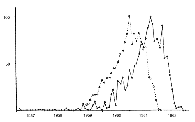 In summary, typical children with FAS are small, mildly mentally retarded, and hyperactive. They have microcephalus and a characteristic face with short palpebral fissures, a broad flat bridge of the nose, a small upturned nose, and a long upper lip with a flat philtrum. The most common ocular findings are esotropia, impaired vision, optic nerve hypoplasia, and tortuous retinal arteries.130 Mental retardation is a cardinal feature of FAS, and FAS is now considered to be the leading cause of mental retardation in the Western world.131 Typical ocular anomalies in FAS may be found in at least 10% of children with mental retardation.132 FAS was originally described in France, a country with a high alcohol consumption, and has since been recognized in many countries, such as Chile,133 Hungary,134,135 Germany,136–138 and Ireland.127,139 The incidence in France is about one in 700 newborns,140 similar to that in Sweden where one in 300 live births may show some alcohol-related defects, and approximately one in 600 have complete manifestations of the syndrome.141 In the United States the incidence is between one in 322142 and one in 750.143 The highest incidence has been noted among American Indians. May and colleagues144 reported rates ranging from one in 100 to one in 750 live births among various Indian tribes in the southwestern United States. The prevalence of alcohol fetopathy among children in an Indian community in British Columbia was estimated to be 190 in 1000 children up to 18 years of age; 64% of the children were mentally retarded.145 FAS is characterized by physical and behavioral disabilities. Mothers may not be “alcoholics” in the stereotypical sense but have abused alcohol during at least part of the pregnancy, Recent reports also have shown cognitive and behavioral deficits in children born to “social drinkers.”146 Approximately one third of the children born to alcoholic mothers have the full FAS.118,137 The nature and extent of damage to the fetus depends on many factors, including the time periods during pregnancy when the woman drank, the amount of alcohol intake, and biologic and genetic features of the fetus and mother. The sooner a woman stops drinking, the better her baby's outcome will be. A mother with one affected child will have children without FAS if she does not drink during subsequent pregnancies. Many women drink alcohol and smoke, a combination that may affect their children adversely.147 The role of malnutrition also is difficult to sort out, as is the use of drugs. Comparative studies involving animals and humans indicate that there is a risk for defects of ocular structures from as early as the third week after fertilization until development is completed. Drugs THALIDOMIDE. Thalidomide was independently synthesized in Germany, Great Britain, and Japan in the mid 1950s. It was marketed as effective therapy for insomnia, anxiety neurosis, and nausea during pregnancy without acute toxic effects even in high doses. As a result, consumption rose rapidly. Complications, such as neurologic symptoms, were soon observed, which prevented its introduction in the United States. In 1960 an unusual kind of severe limb deformities occurred in epidemic proportions. Children were born with amelia and various degrees of phocomelia affecting the upper and lower extremities. Some of the children also had congenital heart disease; ocular, intestinal, and renal anomalies; and deformities of the external ears.148–152 The German pediatrician Lenz became suspicious that thalidomide was the cause of the anomalies. In November 1961 he warned, “From a scientific point of view it seems premature to discuss it. But as a human being and as a citizen, I cannot remain silent about my observations.”152a The drug was withdrawn from the market in late 1961 but remained on the market in Japan until September 1962. Lenz compared the frequency of affected births and the amounts of thalidomide sold each quarter in West Germany and showed that frequency was correlated very closely with thalidomide sales 9 months earlier (Fig. 9). Approximately 5000 children were affected in Germany and 700 each in Japan and Great Britain. Another 26 countries reported cases of thalidomide embryopathy.153 It was estimated that approximately one third of the children died in early infancy because of major defects of vital organs. A detailed analysis of the Japanese cases was published in 1987.154 Based on careful interviews with the mothers about the ingestion of thalidomide, the sensitive period for the teratogenicity of thalidomide was determined12,13 to be from approximately days 20 to 36 after conception (days 35 to 50 after the first day of the last menstrual period) (see Fig. 3). Ocular malformations, such as microphthalmos, coloboma of the iris and uvea, lens attachment to the cornea, optic disc anomalies, paralysis of the sixth and seventh cranial nerves, strabismus, and nystagmus, also were reported.155–161 Recently, a study of Swedes with thalidomide embryopathy revealed that half of the patients had ocular motility disturbances, most often consisting of incomitant strabismus; Duane's syndrome also occurred frequently (Fig. 10A and B ).162,163 Facial palsy (Fig. 11) and abnormal lacrimation were associated with the ocular motility disturbances. A few cases of microphthalmia and coloboma also were noted. Many of the affected patients had shorter or longer than normal axial length, high refractive errors, and corneal astigmatism.164