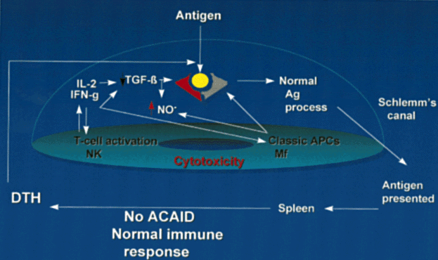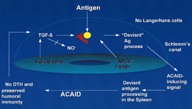 Although DTH is an effective means of eliminating pathogens, it is also potentially very destructive to surrounding tissues because of the intense lymphokine-induced secondary inflammation. Suppression of intraocular DTH by ACAID may have evolved as a means of preserving vision while permitting some degree of local immunity,35 producing what Streilein48 termed a “dangerous compromise” between the eye and the immune system.