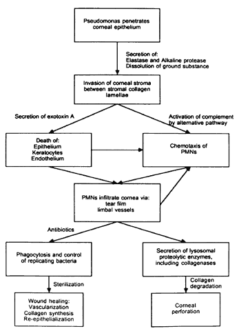 infections of the cornea, especially Pseudomonas corneal ulceration. In any infection, pathogenic organisms must first localize at the target organ or tissue. Unless the organisms are isolated in a closed space from which they cannot escape (e.g., bacteria introduced into the eye during ocular surgery, causing endophthalmitis), they must adhere to the tissue and then colonize the infected mucosal surface. The pathogenicity of a bacterium, its ability to cause infection of a given tissue, is largely related to its ability to adhere to and colonize that tissue. Once sufficient numbers of organisms accumulate on the tissue surface and invade deeper structures, an inflammatory response is elicited in response to the presence of the bacteria. Characteristics of inflammation include vascular dilatation and increased vascular permeability, edema, and infiltration of polymorphonuclear leukocytes (PMNs). If unchecked, the infection causes tissue necrosis, ultimately leading to corneal perforation. The destruction of tissue is due to the liberation of proteolytic enzymes by both the bacteria and the PMNs. An organism's virulence (i.e., ability to cause serious disease rapidly) is related to its ability to induce inflammation and complement of destructive enzymes. If the infection is arrested by antibacterial therapy or the host inflammatory response, the cornea then undergoes a process of repair, which includes neovascularization, collagen resynthesis (scar formation), and re-epithelialization. |