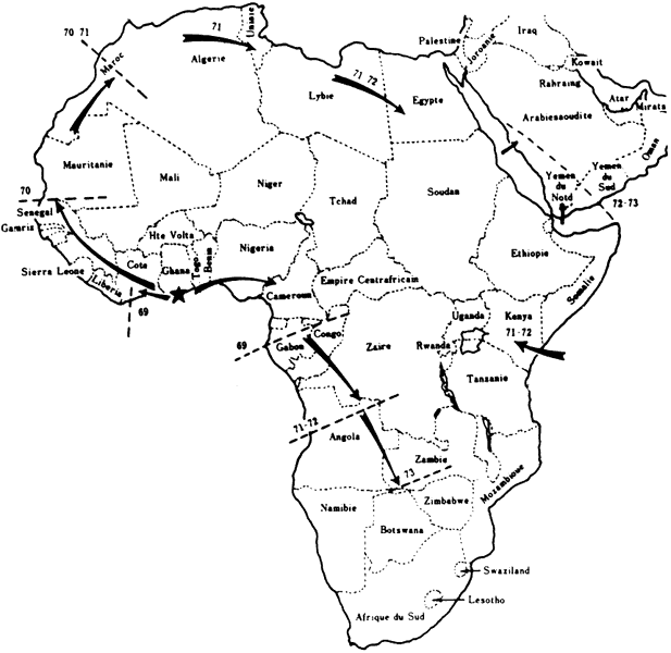 Types 3, 4, and 7 are prevalent causes of pharyngoconjunctival fever; types 8, 19, and 37 are most frequently associated with epidemic keratoconjunctivitis. Adenovirus serotypes occur sporadically over several years in many areas. Specific serotypes may recur in a cyclic pattern (Fig. 20). Genotype changes may account for the emergence of intermediate strains and may play a role in epidemic outbreaks in a susceptible population. Frequency can rise in warm months.92 The relationship of climate to the frequency of adenovirus conjunctivitis (Fig. 21) may be related to methods of transmission. ENTEROVIRUS CONJUNCTIVITIS The first recognized epidemic attributed to enterovirus 70 began in Ghana during 1969 (Fig. 22) and subsequently spread across Africa and the Middle Eastern crescent (Fig. 23), possibly associated with pilgrimages to Mecca. A parallel epidemic caused by enterovirus 70 also erupted in Indonesia in 1969. Another picornavirus, coxsackievirus A24, was first recognized as a cause of acute conjunctivitis causing an epidemic in Singapore in 1970. Both viruses have caused recurring epidemics in Asia (Fig. 24) and spread to Europe and the Americas by travelers and refugees. Several large outbreaks of enterovirus or coxsackievirus conjunctivitis have occurred in the late 20th century, predominantly in the coastal tropics of Africa, Asia, and Central America (Table 24). Small outbreaks and sporadic cases have been recognized in several cities of Europe, the Middle East, Asia, Australia, North America, and South America, and in laboratory accidents. Mixed epidemics of enterovirus 70 and coxsackievirus A24 and of enterovirus 70 and adenovirus have occurred.