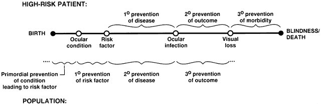 then become relatively more important (Fig. 32). The goal of epidemiology is to discover causal associations that offer opportunities for disease prevention. To aid in decision making, ophthalmologists categorize infections by their clinical manifestations. Epidemiologists may group people by causal criteria, such as contact lens wear or foreign body injury, that might be targeted in a prevention program. Ideally, individuals could be identified before ocular infection occurs, and their risk classified as high, moderate, or negligible. Knowledge of disease pathogenesis can then allow preventive strategies to be tailored to specific situations and circumstances. PRIMARY PREVENTION Prevention of ocular infections can occur at multiple levels (Table 30). Many cases of blinding ocular infection are avoidable by primary and secondary prevention (Fig. 33). Recommendations for public health ophthalmology must judge the relative advantages and shortcomings of each alternative (Table 31).