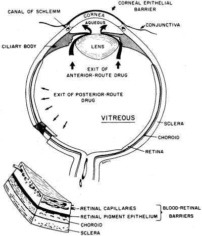 study of what the body does to the drug.1 The eye is one of the few structures that can be considered pharmacokinetically separate from the body. This separation is possible because of two main factors: (1) absorption occurs directly into the eye before reaching the systemic circulation, and (2) elimination occurs directly into the body, which can be considered a large reservoir that can dilute drug concentration below a therapeutic threshold.21 There are five barriers to the entry of drugs into the eye (Fig. 4): Corneal epithelium—Restricts the entry of water-soluble drugs into the cornea and aqueous