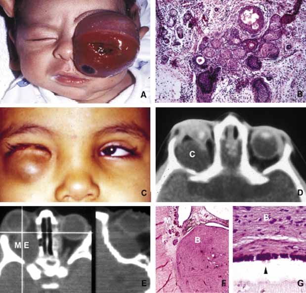 Fig. 1 Congenital lesions. A very large cystic teratoma of a 1-month old child (A). B. Histology of this lesion that contains a variety of tissues, endodermal, ectodermal, and mesenchymal. An orbital cyst (C) in an orbit containing micro-ophthalmic globe. C, D. The protrusion of the cyst inferiorly creates a mechanical lower lid ptosis that narrows the right maldeveloped conjunctival sac even further. Axial and sagittal CT scan showing a meningoencephalocele (ME) occupying the entire orbit (E). The histopathologic examination of the lesion revealed both meningeal (M) and brain (B) tissues (F). The high-power histopathology reveals ciliated ependymal cells lining some of the cystic spaces (arrowhead) (G).
