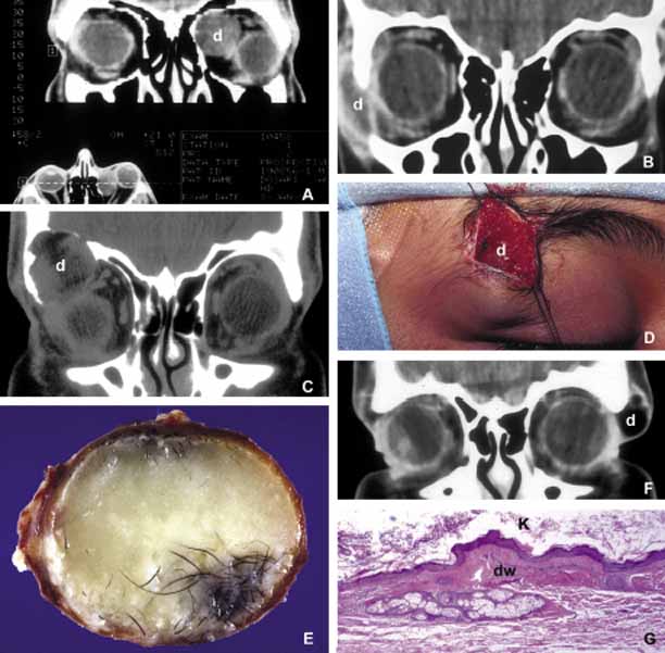 Fig. 2 Dermoid. Different presentations of dermoid (d): superior medial, semi-solid mass pushing the globe down and out (A); a ruptured dermoid causing an inflammatory reaction within adjacent soft tissues (B); a large superior lateral dermoid eroding through the roof of the orbit to extend into the brain (C); extraorbital dermoid within the subcutaneous tissues of the eyebrow (D); gross appearance of the cystic dermoid containing whitish yellow cheesy keratin material intermixed with hair (E); dumbbell dermoid that is present on both sides of the frontozygomatic fissure (F); histopathology of dermoid wall (dw) containing skin appendages, the lumen of the dermoid is lined with stratified squamous epithelium producing keratin (K) (G). ([E] is the courtesy of Amin M. Nasr, MD of Beirut, Lebanon)