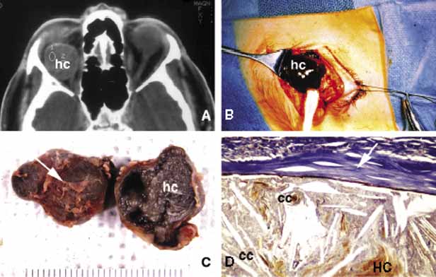 Choristoma, however, is a tumor-like proliferation of tissues that are not normally present at a given body location. The most commonly encountered example of orbital choristoma is a dermoid.16 Dermoids that present with many varieties result from the entrapment of epithelial structures at the site of closure of fetal fissures. Superficial dermoid cysts occur primarily subcutaneously anterior to orbital septum or within the anterior orbit. If the cyst wall is made of epidermis without dermal tissues, it is classified as an epidermoid cyst. These lesions are occasionally lined by conjunctival or pseudostratified respiratory epithelium.17 The superficial lesions must be distinguished from deep orbital dermoids that are usually rounded, encapsulated tumors filled with fatty materials, keratin, and dermal structures such as hair particles. Histopathologically the dermoid wall is lined by keratizing squamous epithelium with dermal appendices including hair follicles and sebaceous and eccrine glands.18