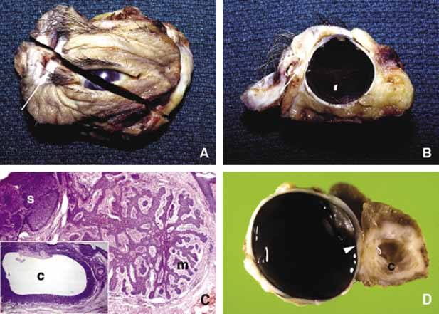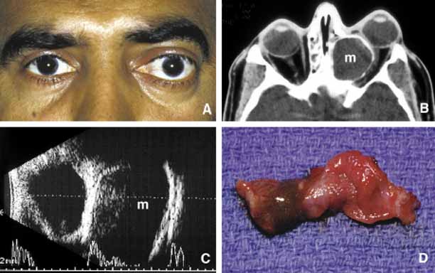 Fig. 5 Mucocele. Moderate proptosis and slight lateral displacement of the left eye secondary to a large medially located mucocele (m) originating from the ethmoid sinus (A,B). Note the compression of the calcified wall of the lesion onto the globe and the optic nerve (B). The large cystic nature of the mucocele with low internal reflectivity and segmentally calcified wall is demonstrated by ultrasonography (C). Gross specimen of the stripped mucosal lining of the mucocele from the same case (D).