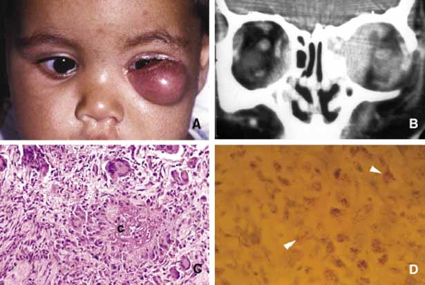 Fig. 7 Orbital tuberculosis. A 2-year-old boy with left orbital tuberculosis (A). Both mother and child had systemic disease. A case of bilateral orbital and perinasal sinus tuberculosis is shown in the coronal CT of a 28-year-old man (B). Note the irregular involvement of the bony tissues of the orbits and the sinuses. C and D show a caseating granuloma (c) and AFB-positive tuberculous bacilli in necrotic inflammation (arrowheads) respectively.