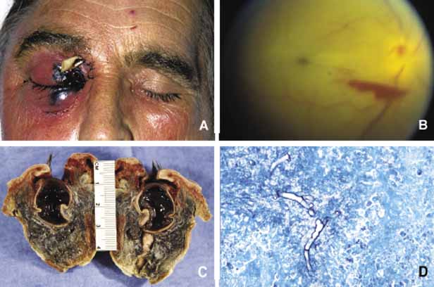Fig. 8 Mucormycosis. The appareance of mucormycosis in the right orbit, periorbital skin and maxillary sinuses of a 60-year-old man with diabetic ketoacidosis (A). B shows the funduscopic apperance of a central retinal artery thromboembolism with resultant “cherry-red spot” from another case of orbital mucormycosis. C shows the extensively necrotic, bloodless cut surface of the exenteration specimen from the patient shown in A. Histopathologic examination of this specimen revealed numerous nonseptated mucormycosis hyphae with 90-degree branching (D) in Gomori methanamine silver (GMS) stain.