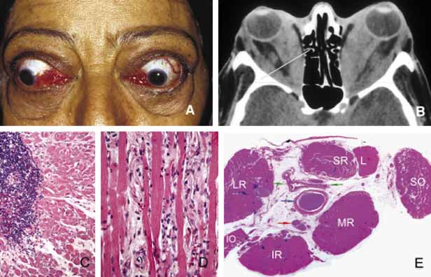 Fig. 9 Graves disease. Clinical findings of Graves disease are depicted in frame A, including bilateral proptosis and lid lag with extraocular motility disturbance, chemosis with prolapse of lacrimal gland and congestion of conjunctival and episcleral blood vessels. Axial CT scan (B) reveals marked swelling of all recti muscles. The histopathologic appearance of the extraocular muscle from a patient with Graves disease reveals chronic inflammatory infiltrates, primarily composed of lymphocytes and plasma cells (C). The extraocular muscle volume is increased because of diffuse endomysial fibrosis, mucopolysacccharide deposition and chronic inflammatory cell infiltration (D). The orbital fat, meninges and the optic nerve (blue arrow), large blood vessels of the orbit, such as ophthalmic artery and its branches (green arrows) and the ciliary ganglion (red arrow) do not show any inflammation. The enlargement of the extraocular muscles are well depicted in frame E, which represents a transverse section, approximately at the level indicated by the yellow line in frame B. (LR: lateral rectus; SR + L: superior rectus and levator complex; SO: superior oblique; MR: medial rectus; IR: inferior rectus; IO: inferior oblique). (Frames C, D, and E are the courtesy of Ralph C. Eagle, MD of Philadelphia, PA)